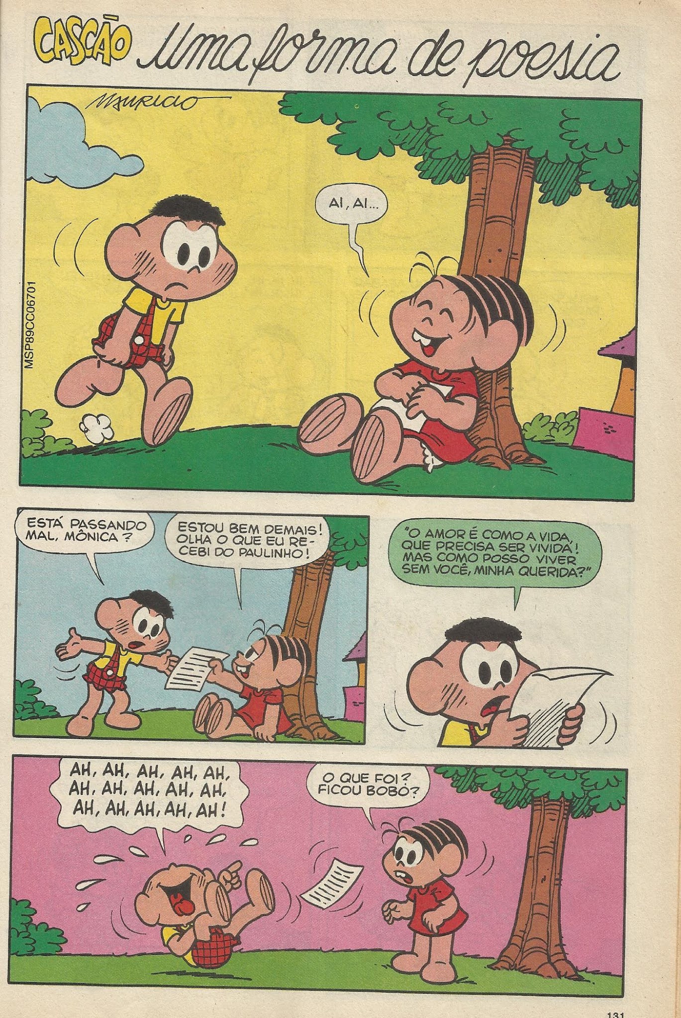 Almanacão de Férias 32 (janeiro de 2001) - Mônica espirra tão forte que envia os amiguinhos para longe. Magali na China, Cascão numa ilha deserta e Cebolinha na Austrália. Franjinha envia Monica num foguete para resgatar a turma. Uma mensagem de Mauricio para a chegada do novo século. Em outras histórias, Bidu defende sua namoradinha, mas na hora de comer é cada um por si. Astronauta não percebe que é tão heroico quanto seu ídolo da TV. Sandoval é transformado em uma múmia por um farmacêutico exagerado. 80 páginas com atividades, o diferencial desses almanacões. Cascão ri da poesia que a Mônica ganhou, tenta fazer uma com a ajuda do Cebolinha ao saber que Maria Cascuda gostou. Um clássico: Chico Bento no Restaurante. Magali com a mão presa na cumbuca dos biscoitos. Anjinho tem que cuidar dos novos meninos da turma: Nimbus e Do Contra. Os pais do Cebolinha numa briga de casal. E a tirinha final, das antigas.