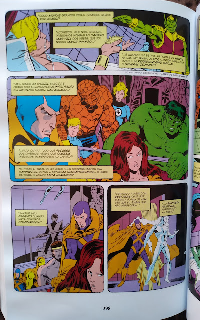 Fechando a edição, novamente é publicada Marvel Fanfare 51 (que saiu em Grandes Tesouros Marvel - Surfista Prateado: Juízo Final), uma história alternativa de Steve Englehart e John Buscema, que seria o começo de uma nova série, mas que mudou de rumos. O editor Al Milton resolveu publicar para que não se perdesse uma bela colaboração de Buscema. Como já descrevi um tempo atrás a história, vou apenas respostar: o Surfista Prateado é atacado por soldados Krees, que tem a missão de acabar com um suposto "Terror". Depois de se recuperar do ataque, ele derrota os soldados, encontrando em seguida Mantis e seu filho "Sprout" (Broto), que usava o nome humano de Arthur. Eles viviam numa cidade pequena e pacífica, sendo o menino o escolhido para trazer uma nova era, pois era filho dos reinos animal e vegetal (Mantis era a Madona Celestial e casou com um ser da raça Cotati em Grandes Heróis Marvel 10). O Surfista revela sua solidão e saudade de Shalla Bal, que não via desde que foi trazida por Mefisto à Terra (Heróis da TV 70). Mantis consegue se comunicar com as plantas de Zenn-La e revela que o planeta foi reconstruído e Shalla Bal foi eleita imperatriz. O pobre Surfista, resignado, amadurece a ideia de que talvez nunca mais a veja. Enquanto isso, a Suprema Inteligência Kree encontra outro avatar para seu ataque, detectando o ódio de bilhões de seres de uma raça na forma de Mangog, que havia sido miniaturizado por Thor (Heróis da TV 55). Ele ataca, Broto revela seu poder transformando-se numa espécie de árvore humana, e o Surfista se entrega para ser destruído no lugar da criança, o verdadeiro alvo do beligerante governante Kree. Mantis mostra a atitude nobre ao filho e diz para ele se inspirar naquele ato. Assim, a alma pura do Surfista Prateado absorve o ódio que alimentava o inimigo e derrota Mangog, indo embora com Mantis e o menino após uma troca de olhares e os pensamentos de Mantis revelam interesse por um companheiro.